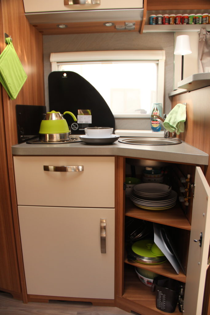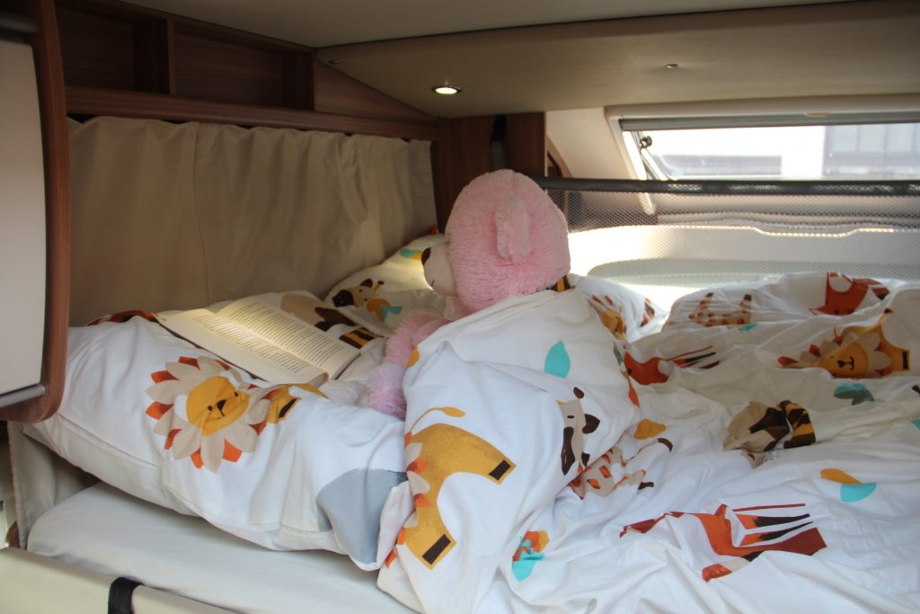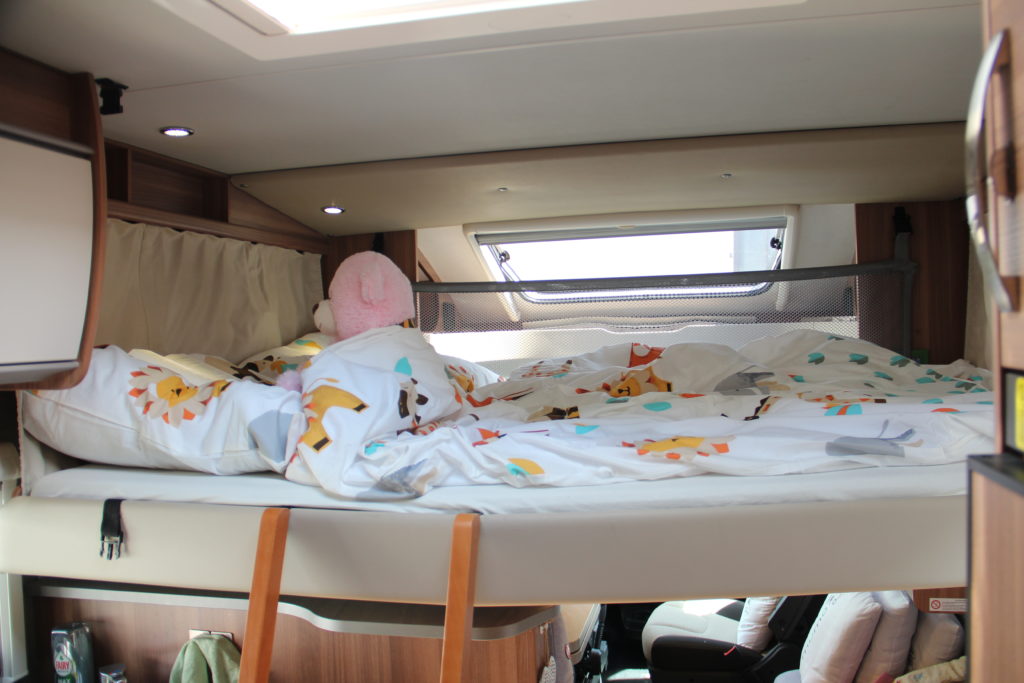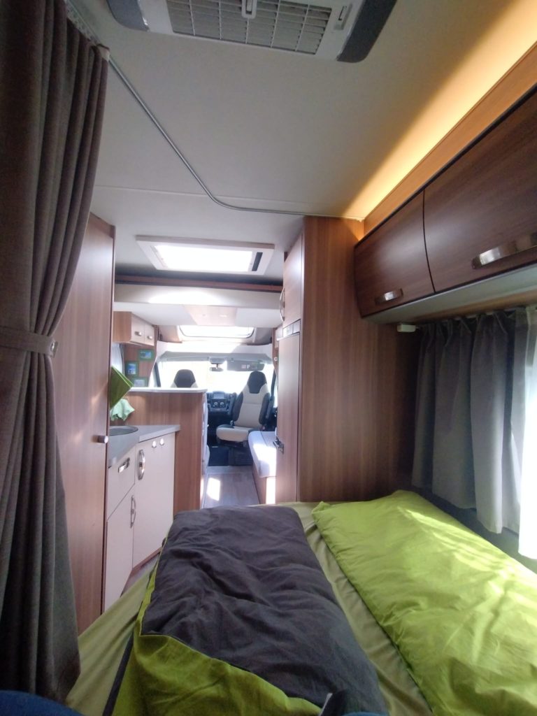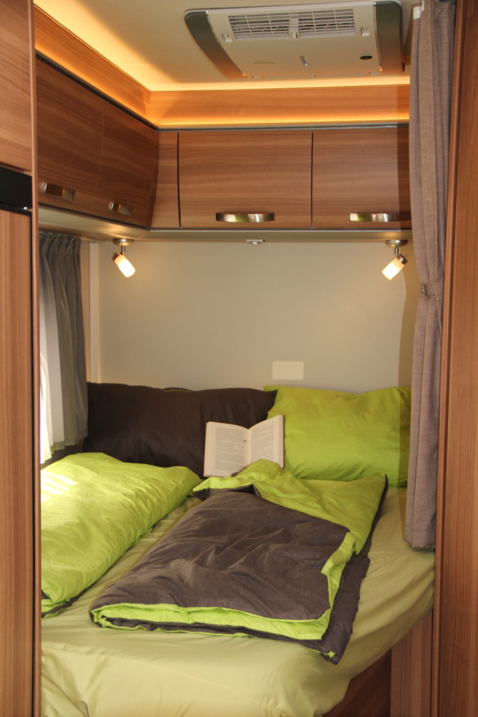 - bis zu 6 Schlafplätze (Doppelbett hinten 130×200, Hubbett über der Sitzgruppe 140×190, Umbau der Sitzgruppe 110×210)